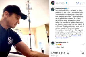 Actor Jeremy Renner took to Instagram to thank Vitti Labs for their part in his recovery. Jeremy wrote… “I just wanted to take a moment to thank the team at Vitti Labs . I have been trying any and all available recovery therapies over the last few years. I got into EV-Opti Drops, which are these eye drops with neuro-optic repair abilities that have helped me see clearer, but also has helped my focus, cognitive function and overall all wellbeing. Their team is doing some pretty cutting-edge stuff in reversing age, traumas, and physical injury that is pretty remarkable. I am excited to continue to use their products through my healing journey.”